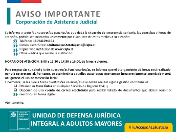 La Unidad de Defensa JurÃdica Integral a Adultos Mayores de Antofagasta, a través de su Abogada, Alexandra Quiroga y Asistente Social, Jimena Tapia Valenzuela, realiza actividad al equipo del Programa VÃnculos de las comunas de San Pedro de Atacama, Calama, MarÃa Elena, Taltal, Mejillones y Tocopilla.