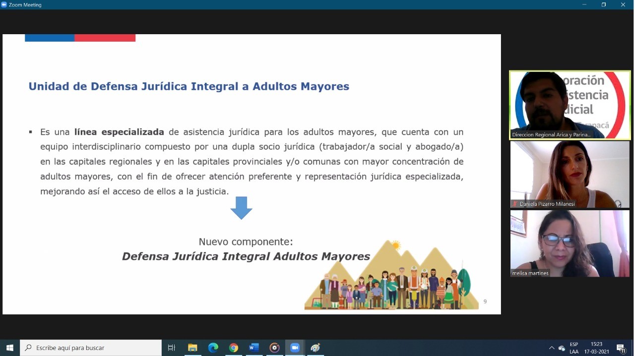 La Unidad de Defensa JurÃdica Integral a Adultos Mayores de la Región de Arica y Parinacota, sostuvo una importante reunión con Melisa MartÃnez Ramos, Directora del Programa Albergue 24 horas, para personas mayores de la Corporación COFEDUC de la ciudad de Arica.
