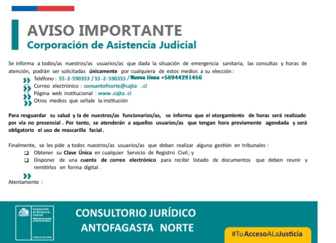 Dejamos afiche digital con datos del Consultorio Jurídico Antofagasta Norte.