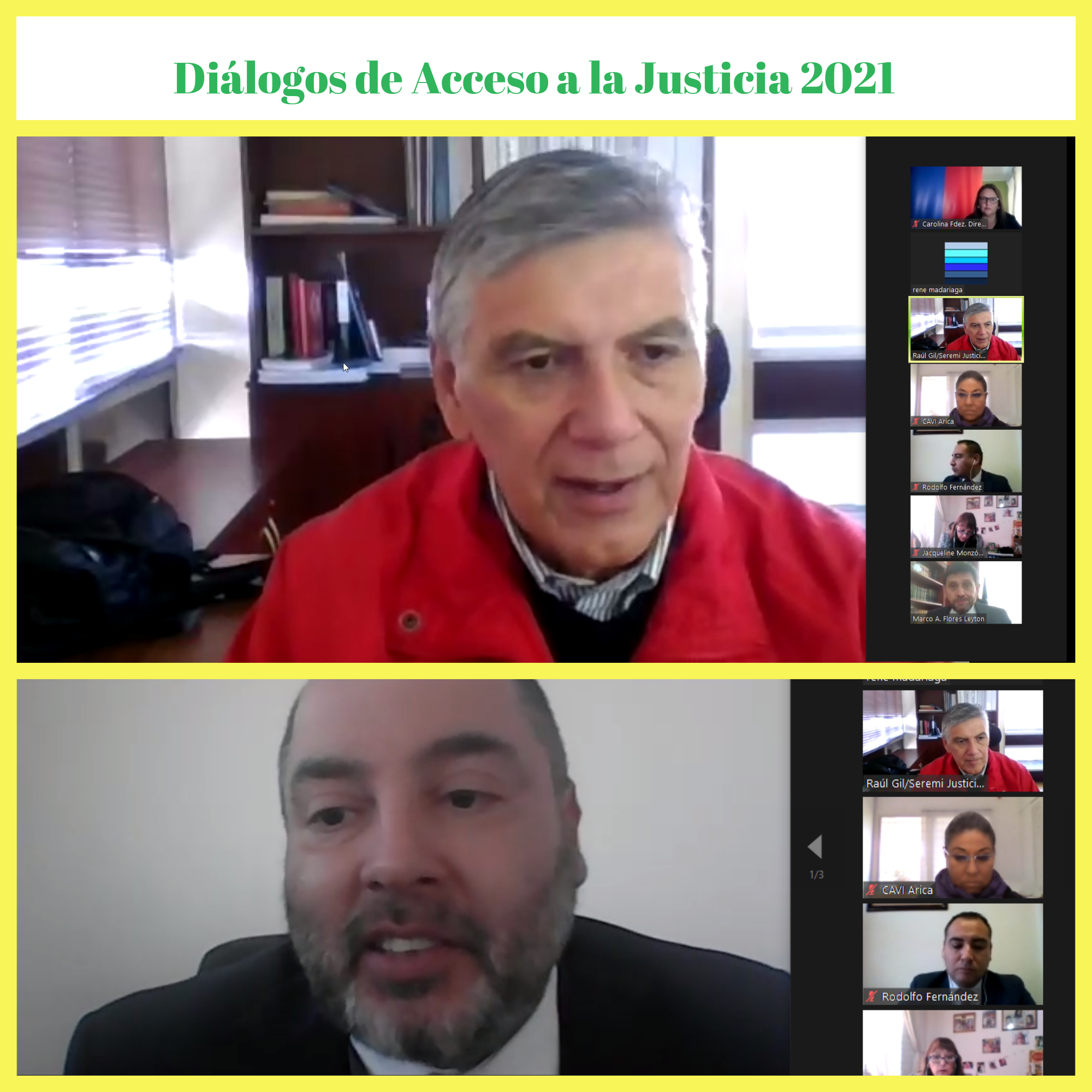 Hoy continúan los Diálogos, los que tienen finalidad fortalecer vÃnculos entre red justicia, para brindar real acceso a la justicia a personas vulnerables en época de pandemia. Participan diferentes servicios públicos y Poder Judicial con el Presidente de la Corte de apelaciones de Arica, Ministro Marco Flores Leyton.