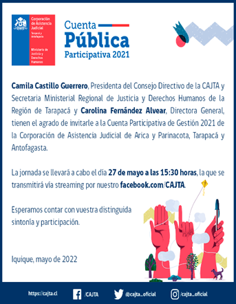 El Director Regional de CAJTA Antofagasta, Giancarlo Fontana Adasme, participó este 24 de mayo en una entrevista en Radio Difusión de la ciudad de Taltal, en la que invito a toda la comunidad a participar en la Cuenta Pública de la Corporación de Asistencia Judicial, la que se transmitirá por vÃa Facebook, el dÃa viernes 27 de Mayo de 2022 a las 15:30 hrs, en la que se informara a toda la comunidad las gestiones y logros durante el año 2021 y los desafÃos que nos hemos plateado para el año 2022.